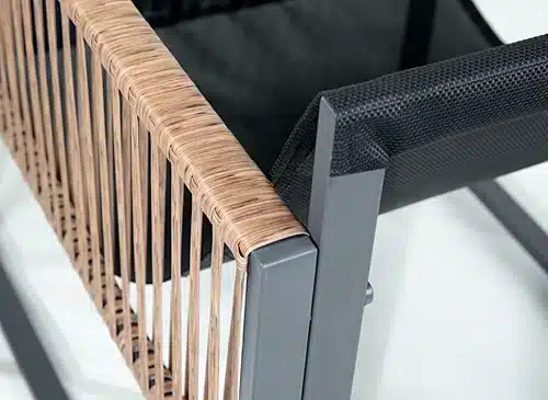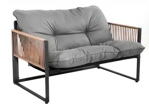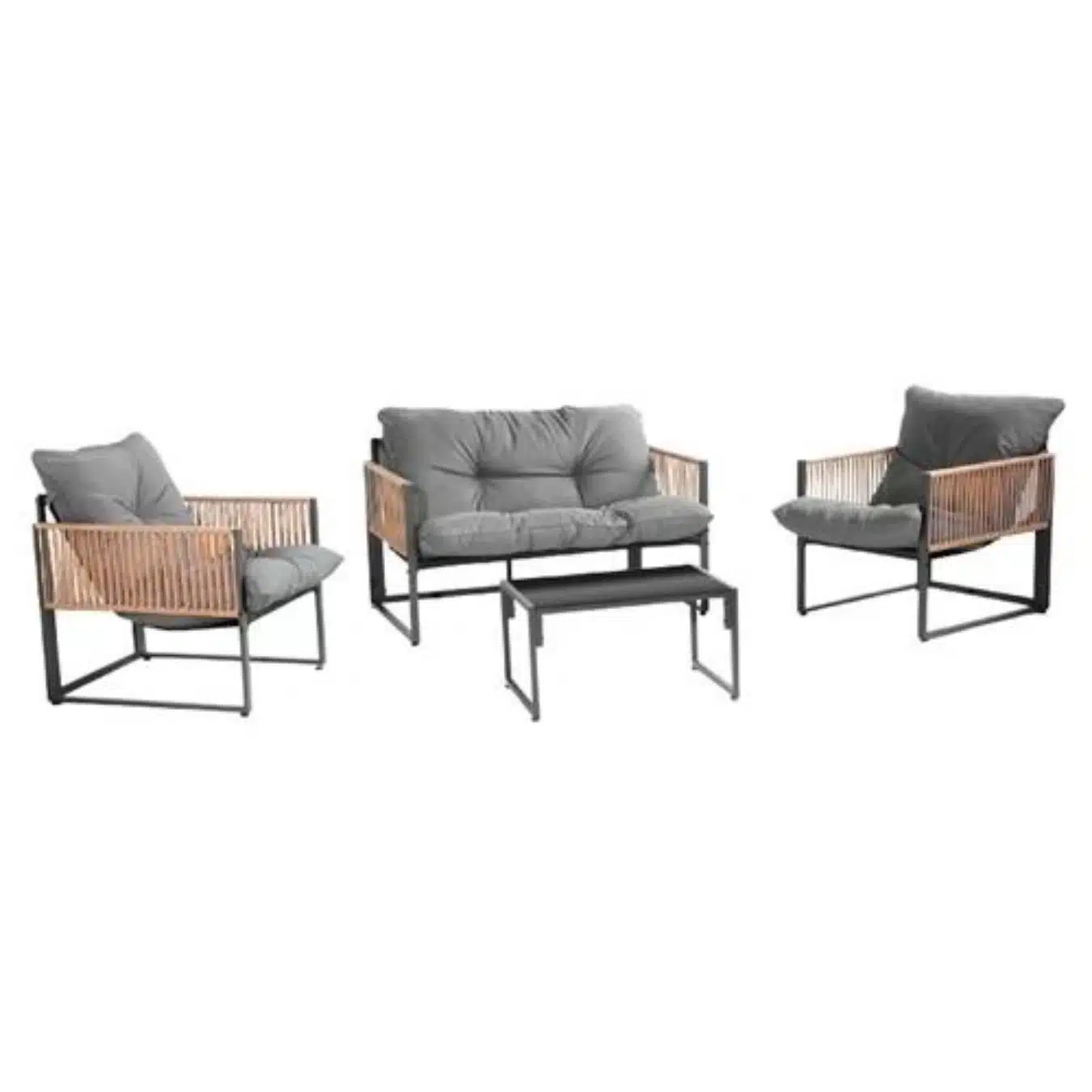 פינת ישיבה מפנקת בעיצוב מודרני משילדת ברזל בשילוב ראטן למראה יוקרתי. פינת הישיבה כוללת ספה דו מושבית + שתי כיסאות יחיד + שולחן אירוח מלבני וכריות מרופדות בגוון אפור.