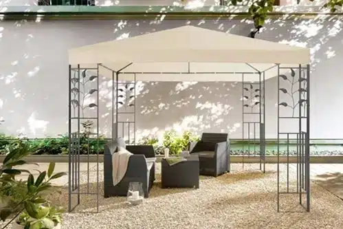 גזיבו איכותי בעל שלדת מתכת, ומוטות בעיצוב מתכת מיוחד בצורת עלים.