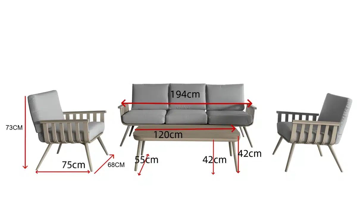 -מערכת ישיבה הכוללת ספה תלת מושבית ו-2 כורסאות יחיד ושולחן. -עשויה שלדת אלומיניום מצופה בציפוי אלקטרוסטטי בז' המעניק עמידות בפני חלודה ופגעי מזג האוויר. -ריפוד נוח במיוחד, מושבים וכריות גב עם ריפוד בעובי 13 ס"מ העשוי מבד פוליאסטר נעים וקל לניקוי בגוון אפור בהיר. -עיטור דמוי עץ במשענת היד למראה יוקרתי ואלגנטי. -שולחן עם רגלי אלומיניום ומשטח דמוי עץ, עמיד בפני חום ורטיבות, חזק ובטיחותי. -יכולת נשיאה מקסימלית בכורסת יחיד-120 ק"ג /בספה תלת מושבית -360 ק"ג / בשולחן- 30 ק"ג .