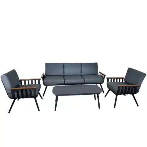 סט מערכת ישיבה הכולל שתי כורסאות יחיד, ספה תלת מושבית בגוון שחור עם כריות בגוון אפור כהה ושולחן רחב הסט עשוי שלדת אלומניום איכותי.