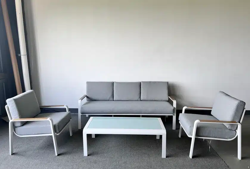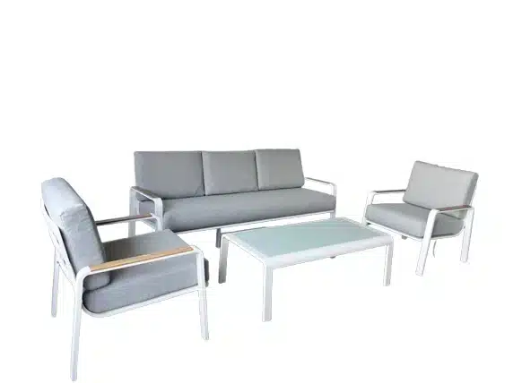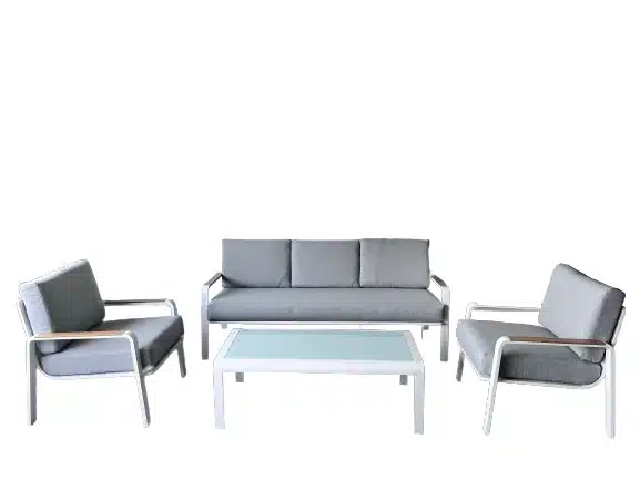 מערכת ישיבה 4 חלקים דגם איטליה לבן סט מערכת ישיבה הכולל שתי כורסאות יחיד, ספה תלת מושבית בגוון לבן עם כריות בגוון אפור בהיר הסט עשוי שלדת אלומניום איכותי.