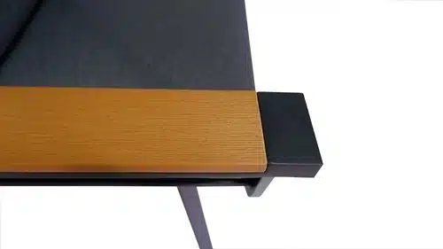 פינת ישיבה בעיצוב חדשני משילדת אלומיניום בשילוב דמוי עץ על משענות היד למראה יוקרתי.