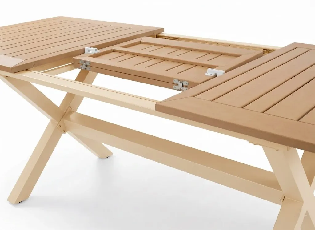 מנגנון פתיחה השולחן נפתח באמצעות מנגנון מסילות פנימי. יחידת ההארכה (גם היא מלוחות Poly-Wood) מאוחסנת בתוך השולחן ונשלפת בקלות בעת הצורך.