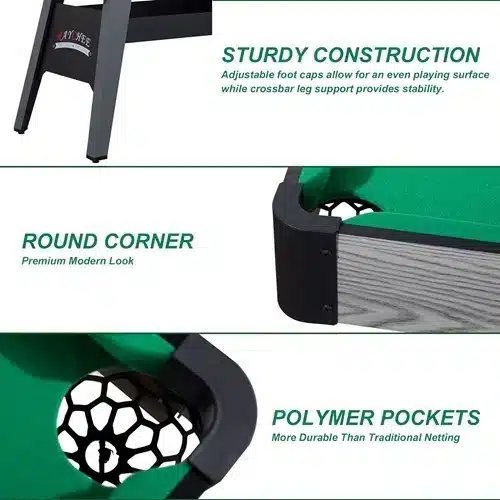 – מבנה עמיד ויציב: MDF באיכות גבוהה, 4 רגליים חזקות עם יתד מתכוונן נגד החלקה. – משטח באיכות גבוהה: עמיד בפני שריטות, כיסי רשת חזקים. – קל להרכבה: משטח מורכב מראש, כולל חוברת הוראות ולהרכבה קלה (מגיע לא מורכב) – גודל קומפקטי: לחיסכון במקום ואחסון קל, גובה מותניים נוח.