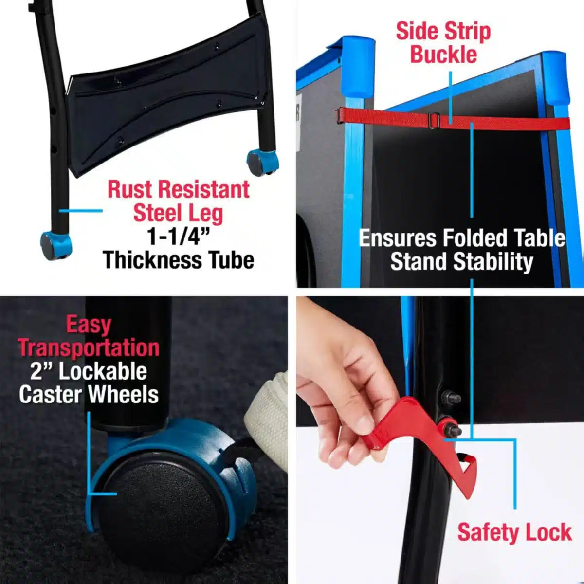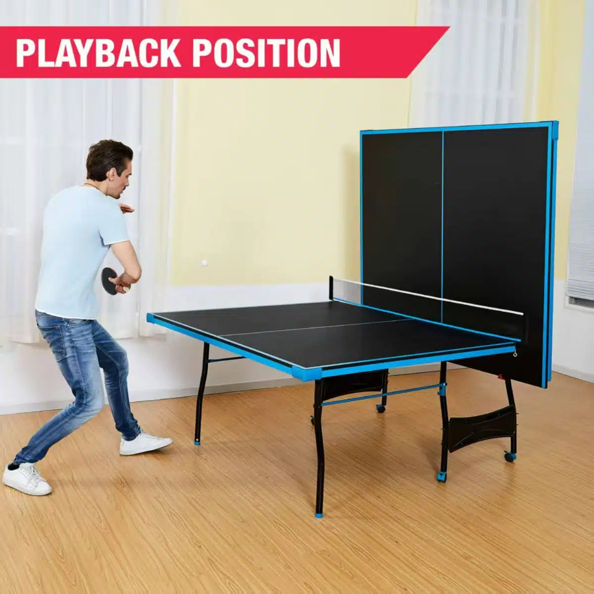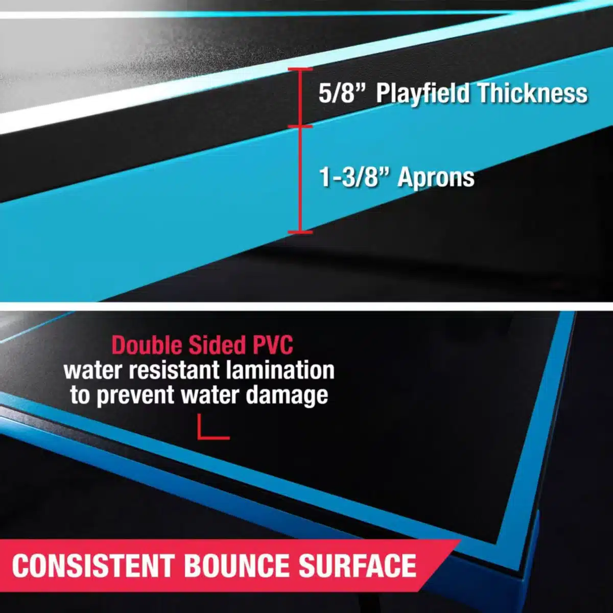 -שולחן טניס מקצועי בגודל טורניר , במידות הסטנדרטיות שנקבעו ע"י התאחדות הבינלאומית. -קיפול חצי השולחן מאפשר אימון לשחקן יחיד . -משטח המשחק עשוי מלוח שבבי עץ בעובי 15 מ"מ עם למינציית PVC דו צדדית, מבטיח קפיצה אחידה. -מסגרת חיזוק 35 מ"מ ורגליי פלדה ליציבות מירבית. -כיסוי פינות בפלסטיק שחור להגנה ובטיחות. -4 גלגלים ננעלים, לניידות ואחסון נוח. -שולחן מתקפל ל2 חצאים, בגובה 185 ס"מ. -השולחן מיועד לשימוש פנימי בלבד.